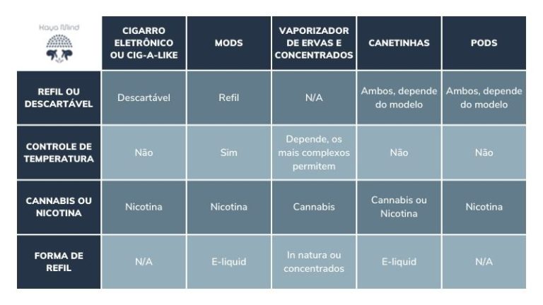 No entanto, existem diversos tipos de vaporizadores: os cigarros eletrônicos (dispositivos que imitam o cigarro), as “canetinhas”, os pods descartáveis ou com refil e com essência ou não, os mods (que produzem mais fumaça e usam menos nicotina), os mods mais avançados e personalizados, entre outros.